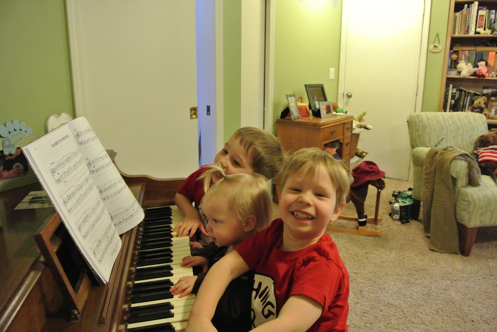 Amelia loves playing on my piano. She goes nuts when I play it and wants to sit with me all the time. She often says, "Play! Play!" meaning she wants to sit at the bench and pound on the keys. I can't wait until she's big enough to take lessons.Parker and Loudon also like to play with her--in another year Loudon will start his lessons. How lucky is he?